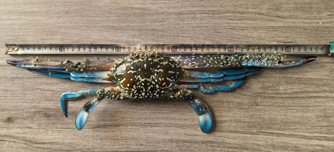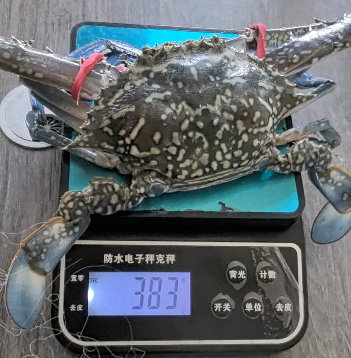 今年5月份,宁海海洋生物种业研究院成功突破远海梭子蟹室内规模化人工育苗技术,并向全国多省份试点推广养殖,其中东营是山东省首家试点。5月23日投放仔蟹二期苗种2万只,截至9月27日已回捕商品蟹2400余斤,养殖成活率超25%,仍有大量商品蟹存塘,养殖成活率远高于传统三疣梭子蟹不足5%的池塘养殖成活率。现场测得的雄蟹平均体重为308 g(最大个体体重376g),雌蟹平均体重187克g(最大个体体重274 g)。